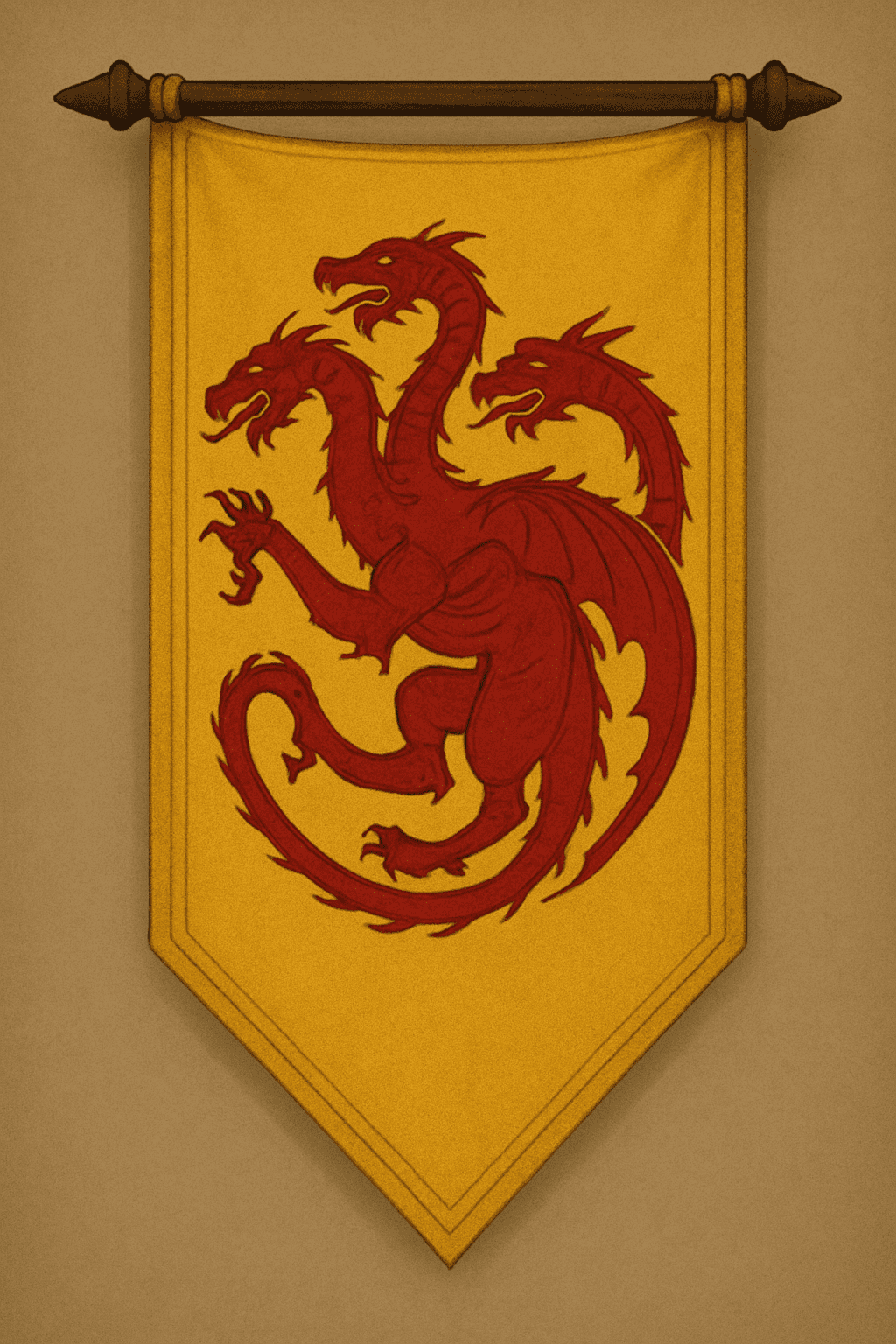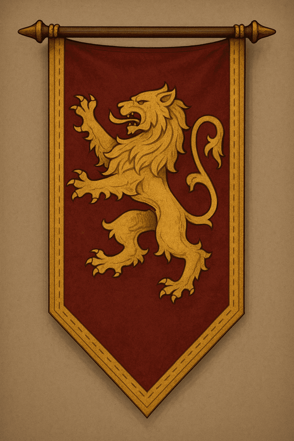 Kral Hanedanı. Cesaret, liderlik ve asaleti simgeler. Sarı ve kırmızı zemin üzerine kükreyen altın bir